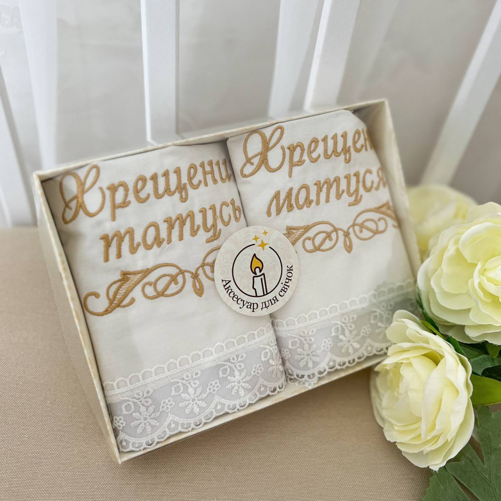 В комплект входят две изысканные салфетки-юбочки из поплина для крестильных свечей - обычно для обряда используют две свечи (но иногда 4 штуки): одна крёстной матери, другая крёстному отцу.
