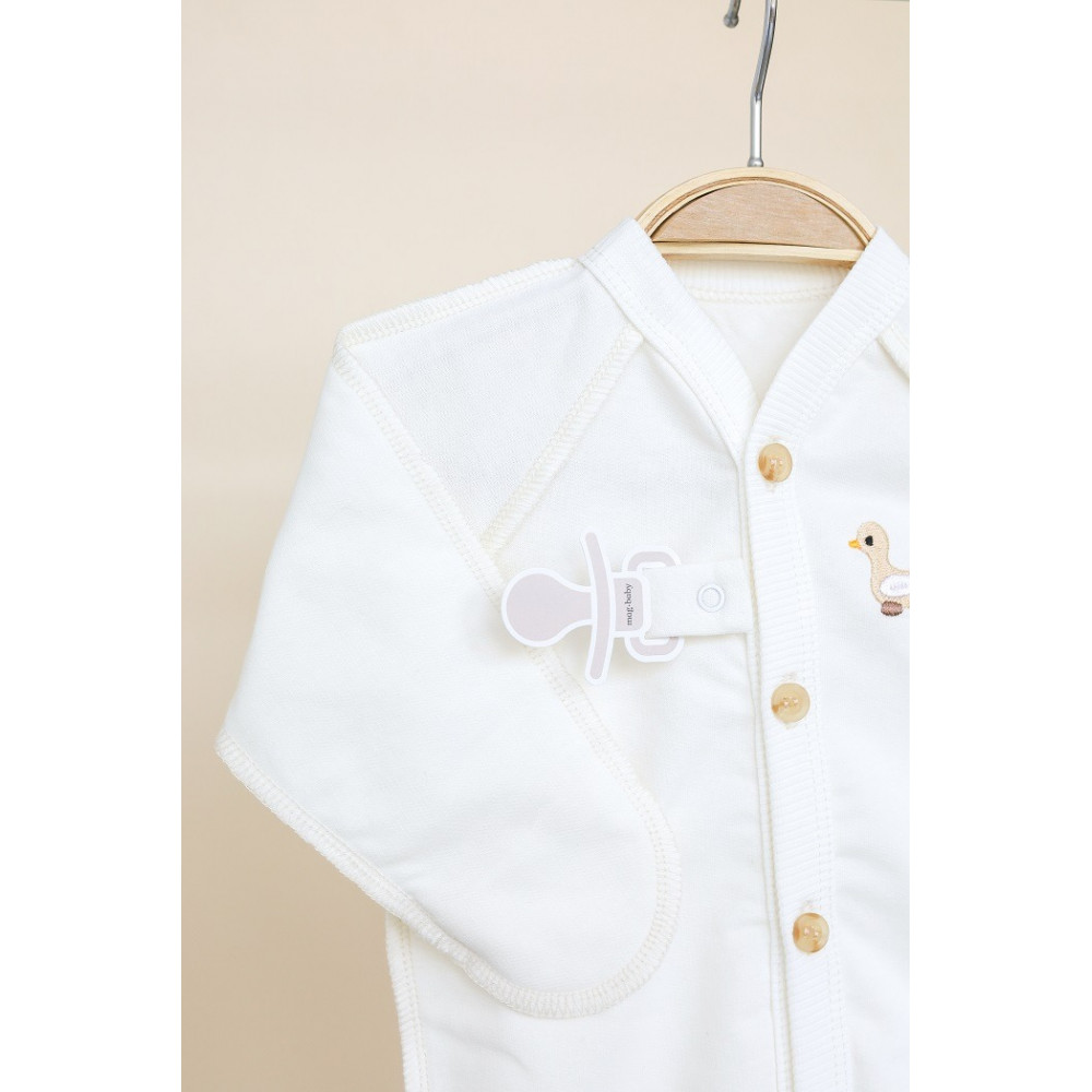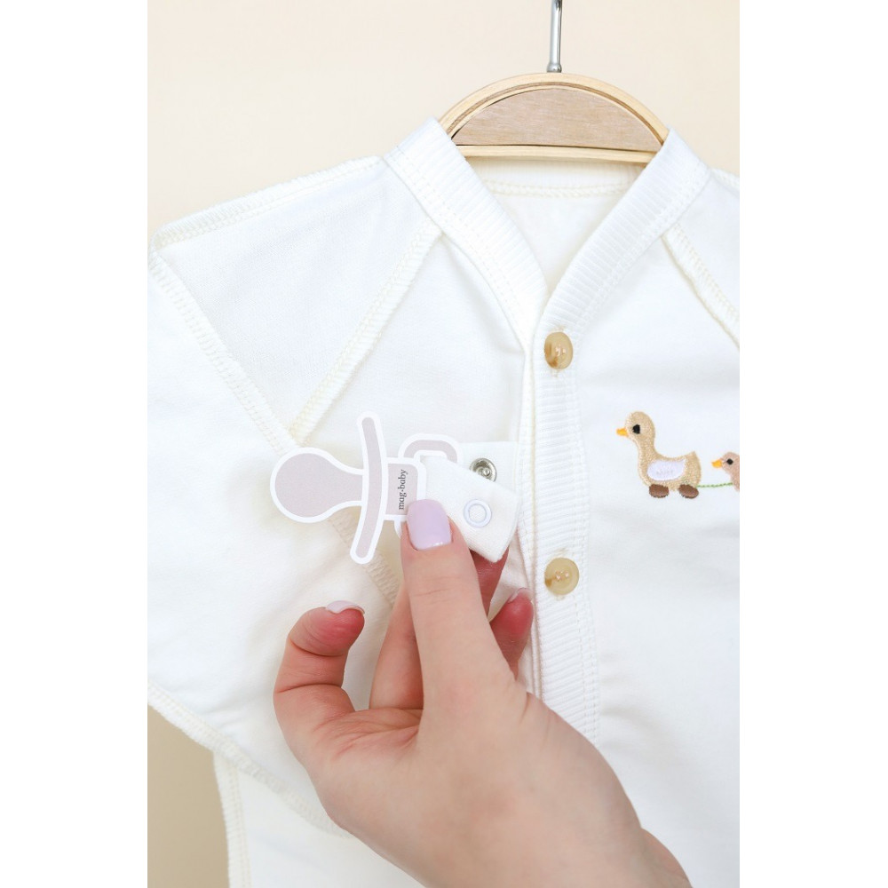 • Між 1 і 2 ґудзиком є тримач для пустушки на кнопці, що дуже зручно. Завдяки цьому можна обійтися без зайвих прибамбасів — під час сну вони не заважатимуть і пустушка не загубиться.