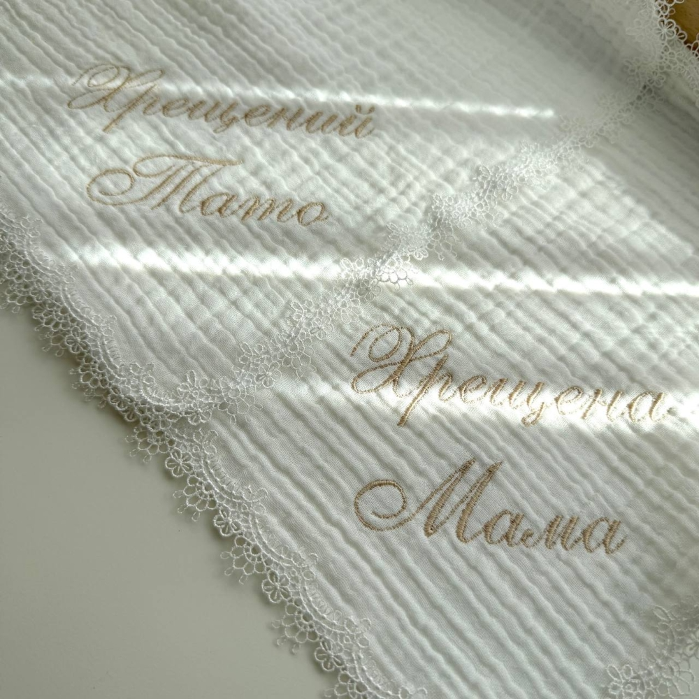 До набору входить - крижма муслінова з мереживом та вишивкою, 2 серветки для хрестильних свічок з мереживом та вишивкою, а також мішечок для першого локону з вишивкою.
