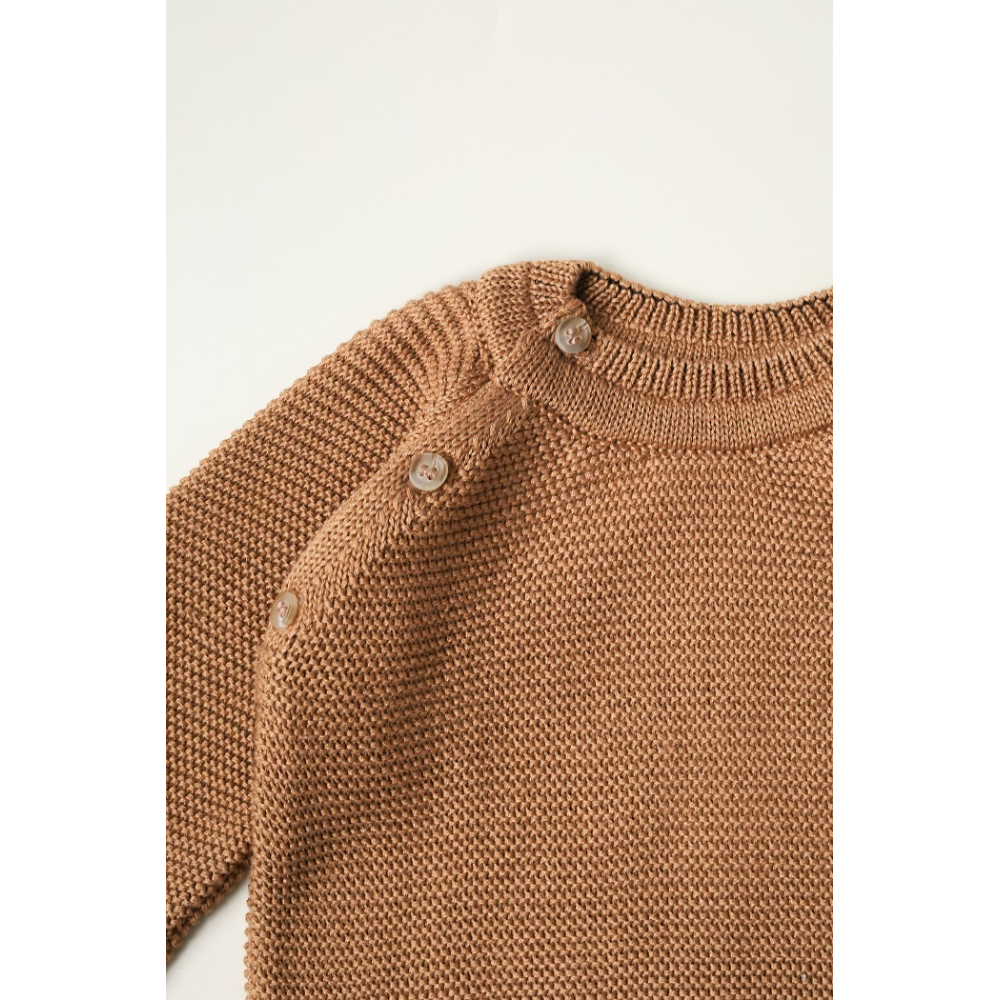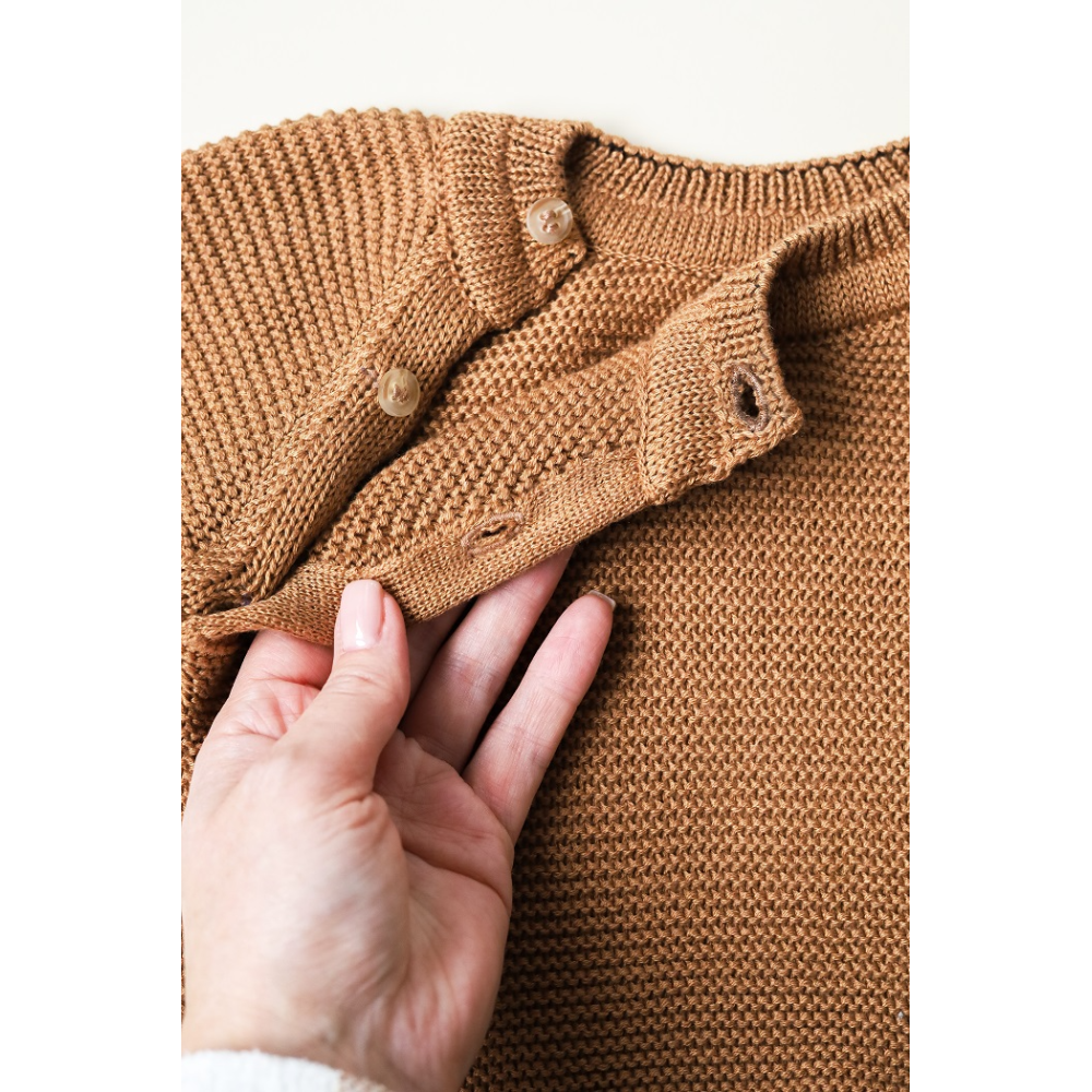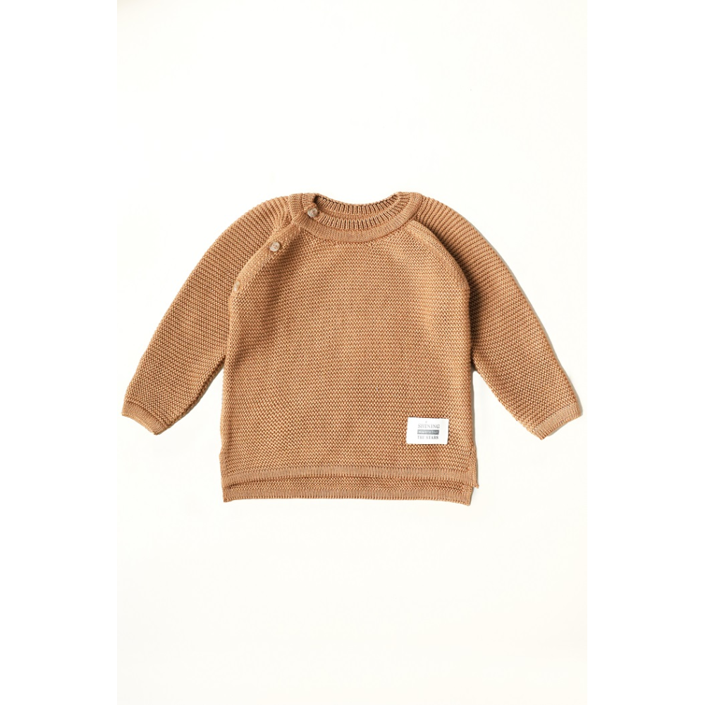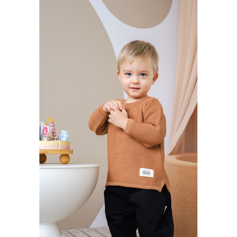 Ґудзики на плечику допомагають легко одягнути светрик, навіть якщо малюк сьогодні не в настрої вдягатися в принципі. Спинка трохи подовжена, зручні розрізи по боках і охайна нашивка роблять модель дуже акуратною та «дорослою» на вигляд.