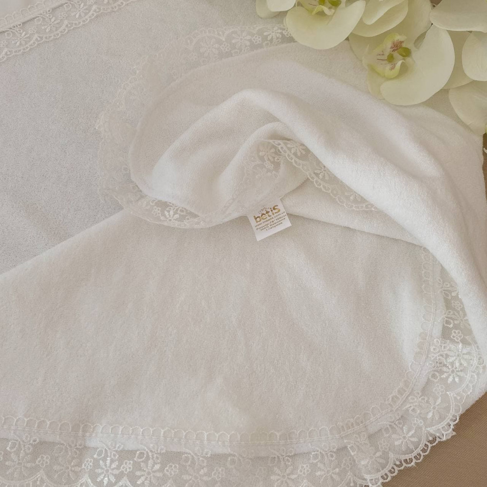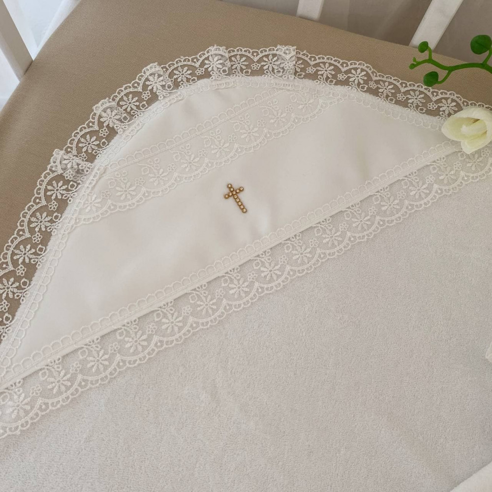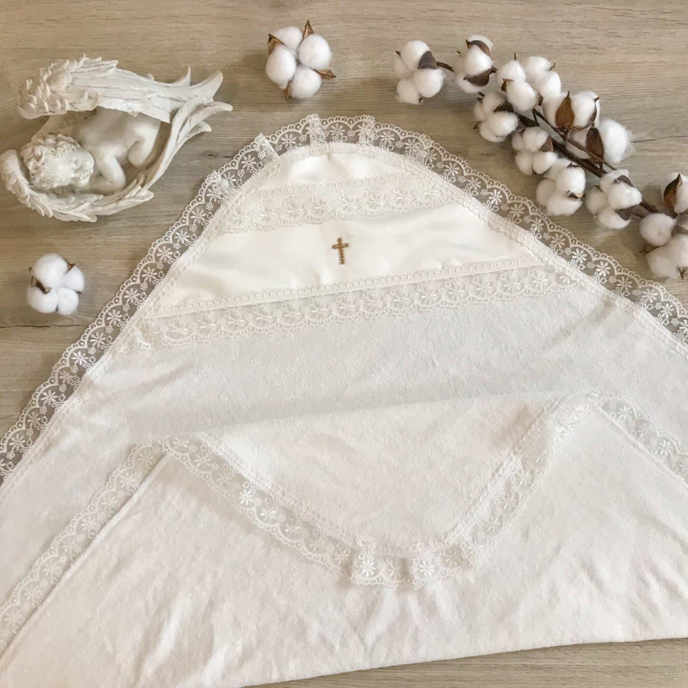 Данная крыжма не только красивая, но и тёплая: подойдет для крестин в любое время года, кроме жаркого лета.