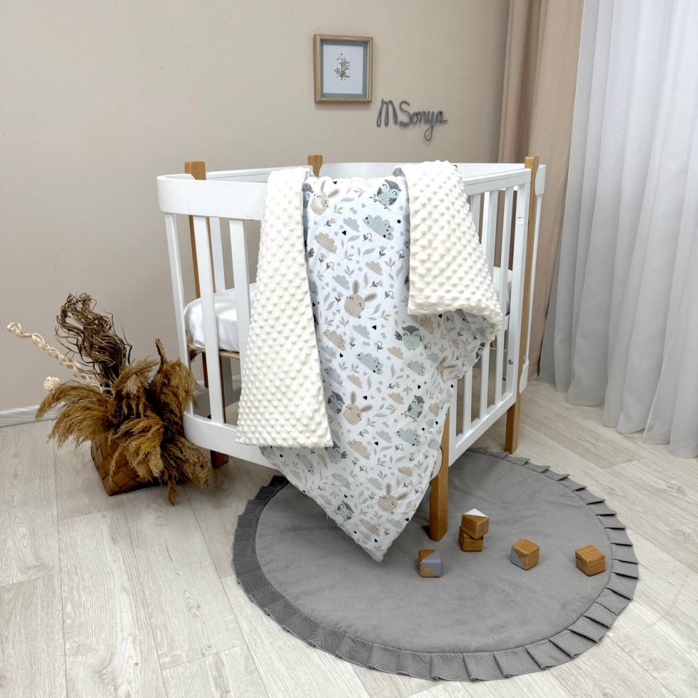 Плюш Minky - очень нежный материал с коротким ворсом, имеет мягкую текстуру "пузырьков". По комфорту и свойствам сохранения тепла не уступает шерсти и гораздо теплее флиса. Поплин/сатин - это ткани из натуральных волокон, идеально подходящие для детского постельного белья.