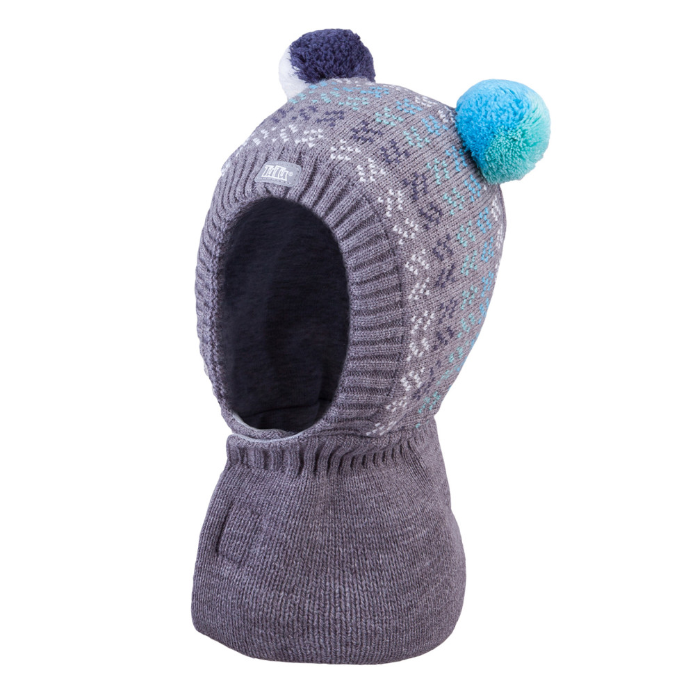 Отличная посадка и высокая степень качества. Шапка скроена по принципу удобного капора, что позволяет закрывать не только уши, но и шею. Такая модель очень удобна для малышей, ведь шапку шлем легко одевать, она не теряется, заменяет собой фактически два изделия (шапку и шарф либо манишку), элементарна в уходе и прекрасно сочетаема практически с любой верхней одеждой. Сверху украшена эффектными бубонами из пряжи.