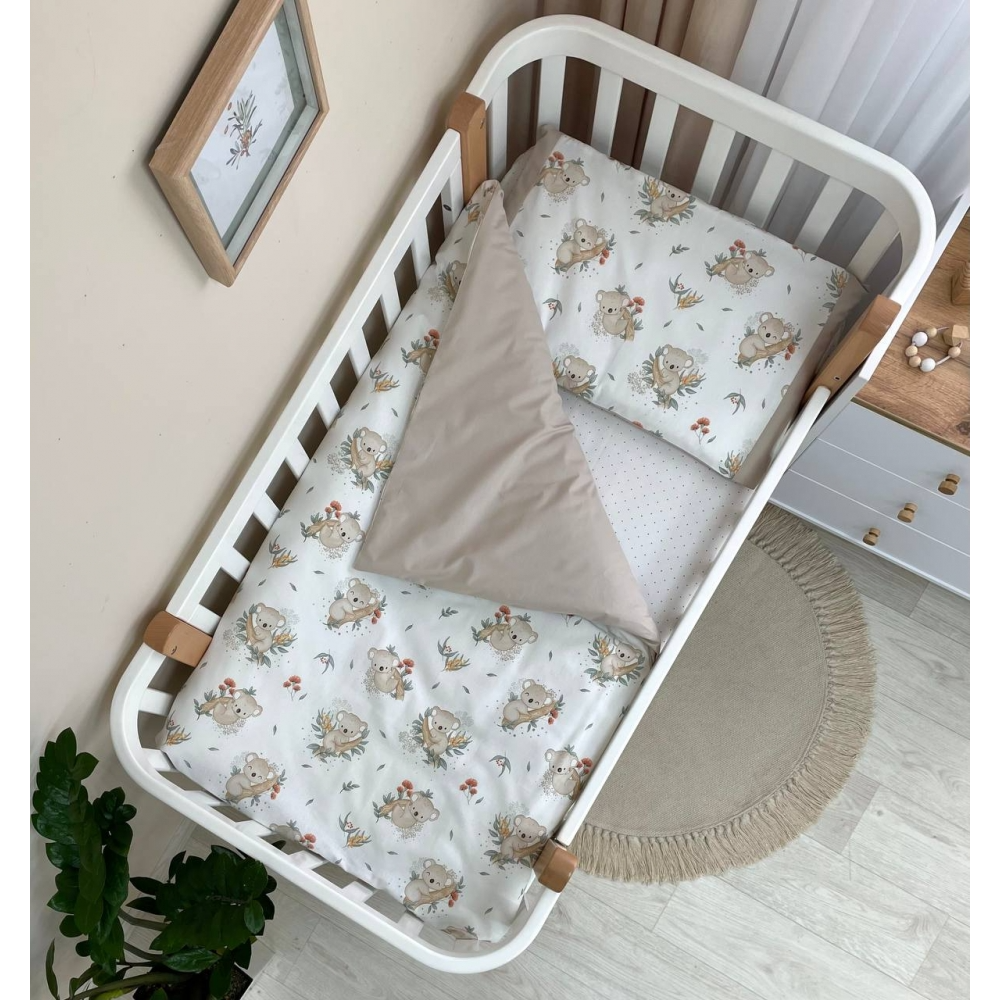 Пододеяльник, наволочка и простынь, пошиты из натурального хлопчатобумажного материала. Простынь на резинке идеально повторяет форму матраса в кроватке. Ребенок будет чувствовать себя свободно, а мамочке можно быть спокойной, что простынка нигде не сомнется.