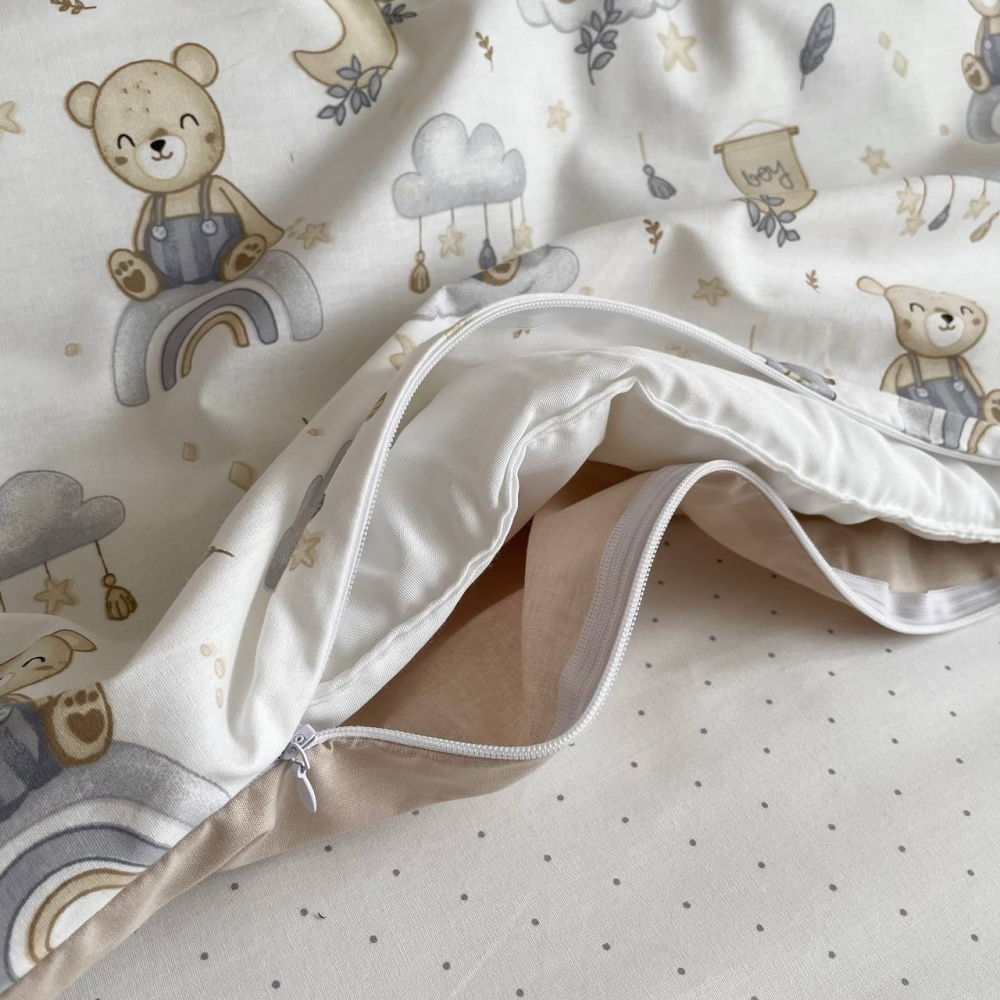 Пододеяльник, наволочка и простынь, пошиты из натурального хлопчатобумажного материала. Простынь на резинке идеально повторяет форму матраса в кроватке. Ребенок будет чувствовать себя свободно, а мамочке можно быть спокойной, что простынка нигде не сомнется.