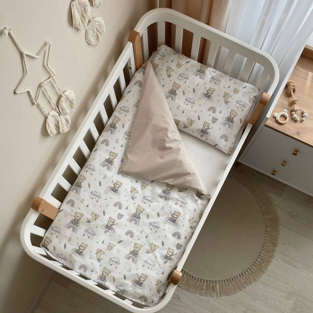 Комплект сменного постельного белья в кроватку состоит из 3х предметов: