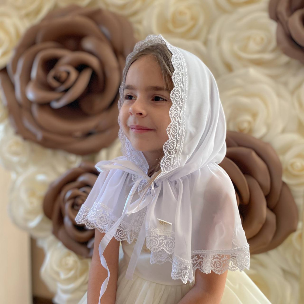 Палантин "Хрестильна скринька" дитячий (шифон), білий 60х90 см - це витончений аксесуар, створений спеціально для особливого дня - хрестин вашої маленької принцеси. Виготовлений з ніжного матеріалу - шифону, він надає палантину легкості і елегантності.
