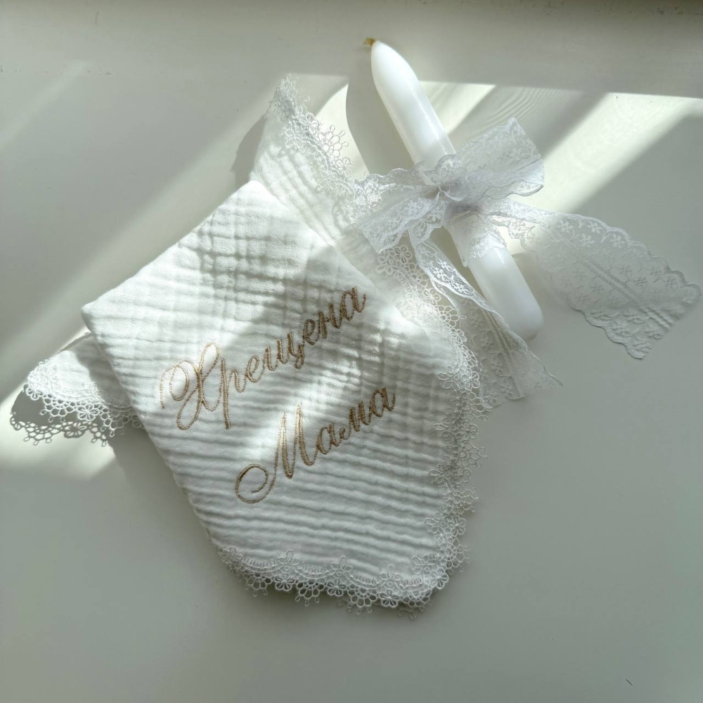До набору входить - крижма муслінова з мереживом та вишивкою, 2 серветки для хрестильних свічок з мереживом та вишивкою, а також мішечок для першого локону з вишивкою.