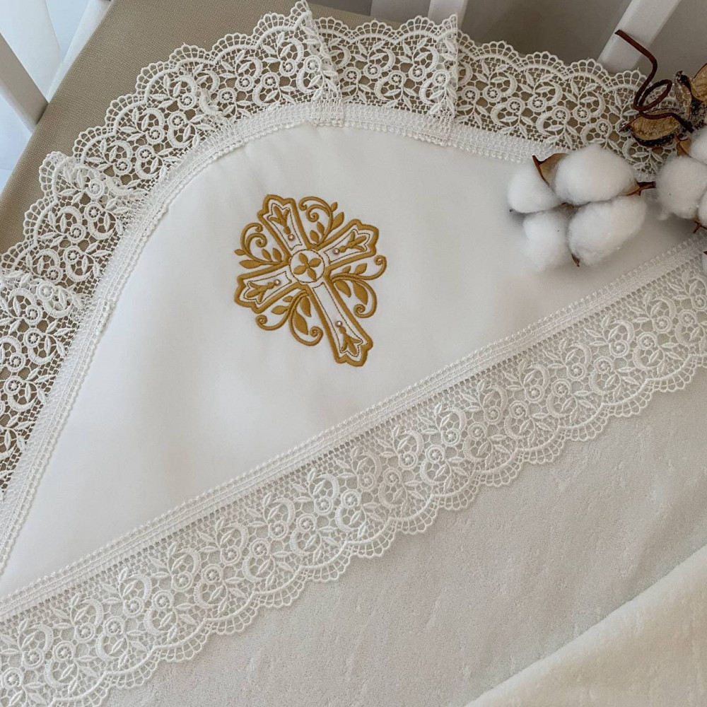 Крижма виготовлена з молочної махри, що надає їй м'якість і ніжність, тож ваша дитина буде почувати себе комфортно під час хрещення. Розмір крижми - 75 на 100 см, що робить її ідеальною для дитини до року.