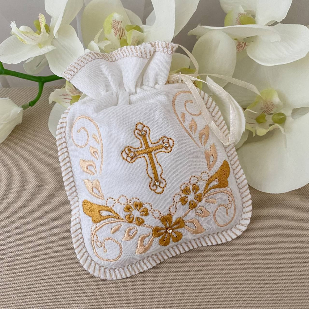 Мішечок для локону "Скарбничка янгола" інтерлок (молочний/золото)